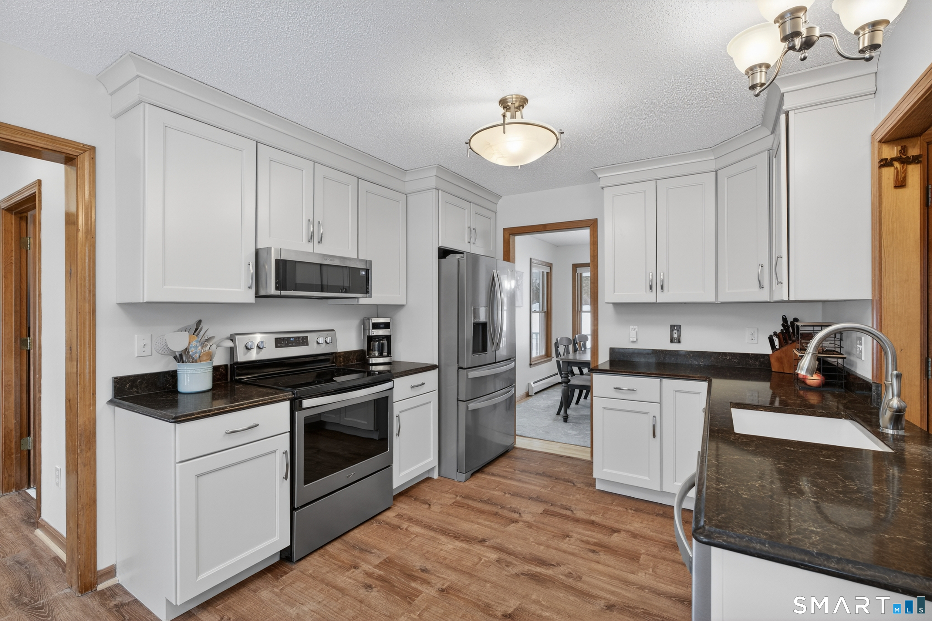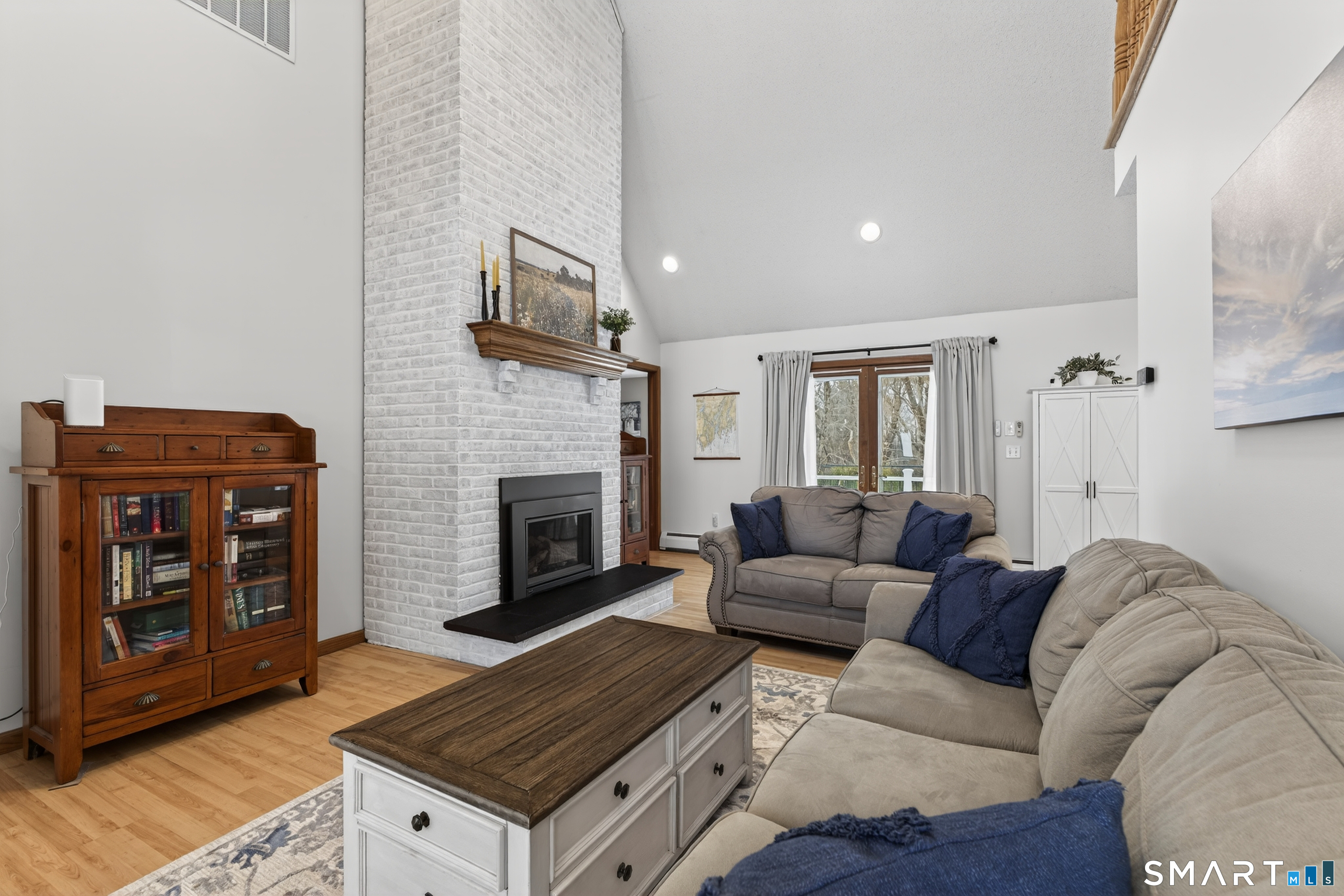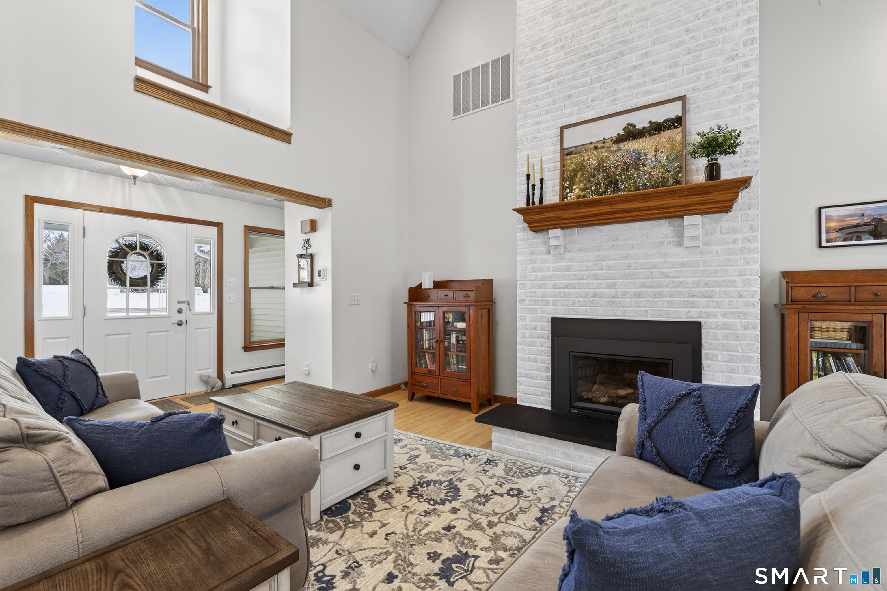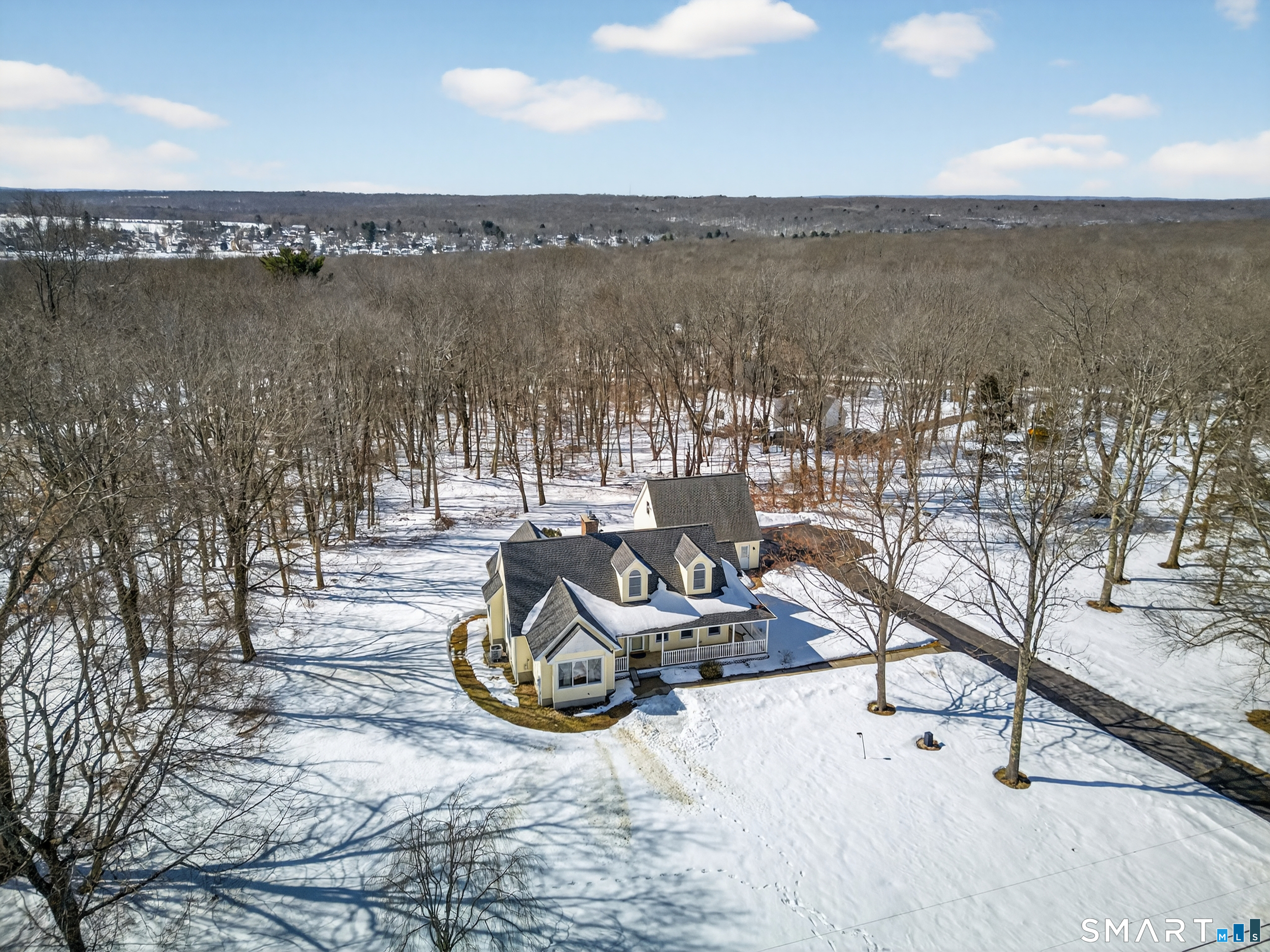 Charming storybook ranch with Cape-style curb appeal, complete with wrap-around front porch and classic dormers, set on a spacious yard bordered by woods. This thoughtfully designed home offers the ease of one-level living with dramatic architectural features and modern energy-efficient systems. The remodeled kitchen (approx. 4 years old) opens to a formal dining room, perfect for entertaining. A convenient mudroom leads to the laundry and pantry area for everyday functionality. The stunning two-story family room features a floor-to-ceiling fireplace and an open loft above, creating a bright, airy focal point. The private owner's suite includes deck access-ideal for a future hot tub-along with a custom walk-in closet system and a spa-like bath with double sinks, glass shower, and a large whirlpool tub. Two additional bedrooms and a full bath complete the main level. The finished walkout lower level provides flexible living space for a recreation room, home office, or gym. Energy efficiency is a major highlight with a nearly new heat pump for heating and cooling, plus newer bb heat for colder temperatures, delivering impressive utility savings. Located beside the desirable Woodbine neighborhood, this home offers a peaceful setting with great walking areas while still being convenient to town amenities