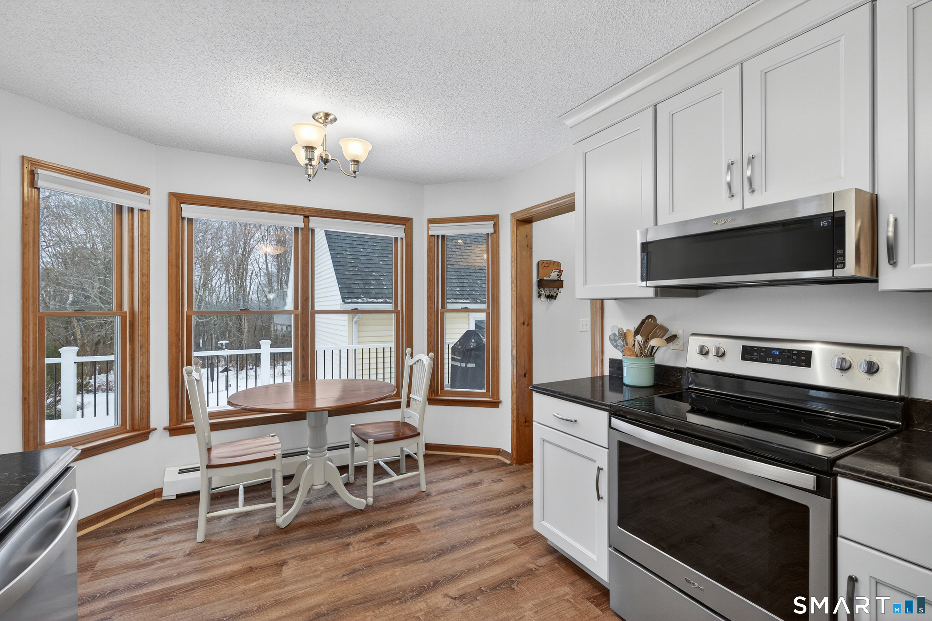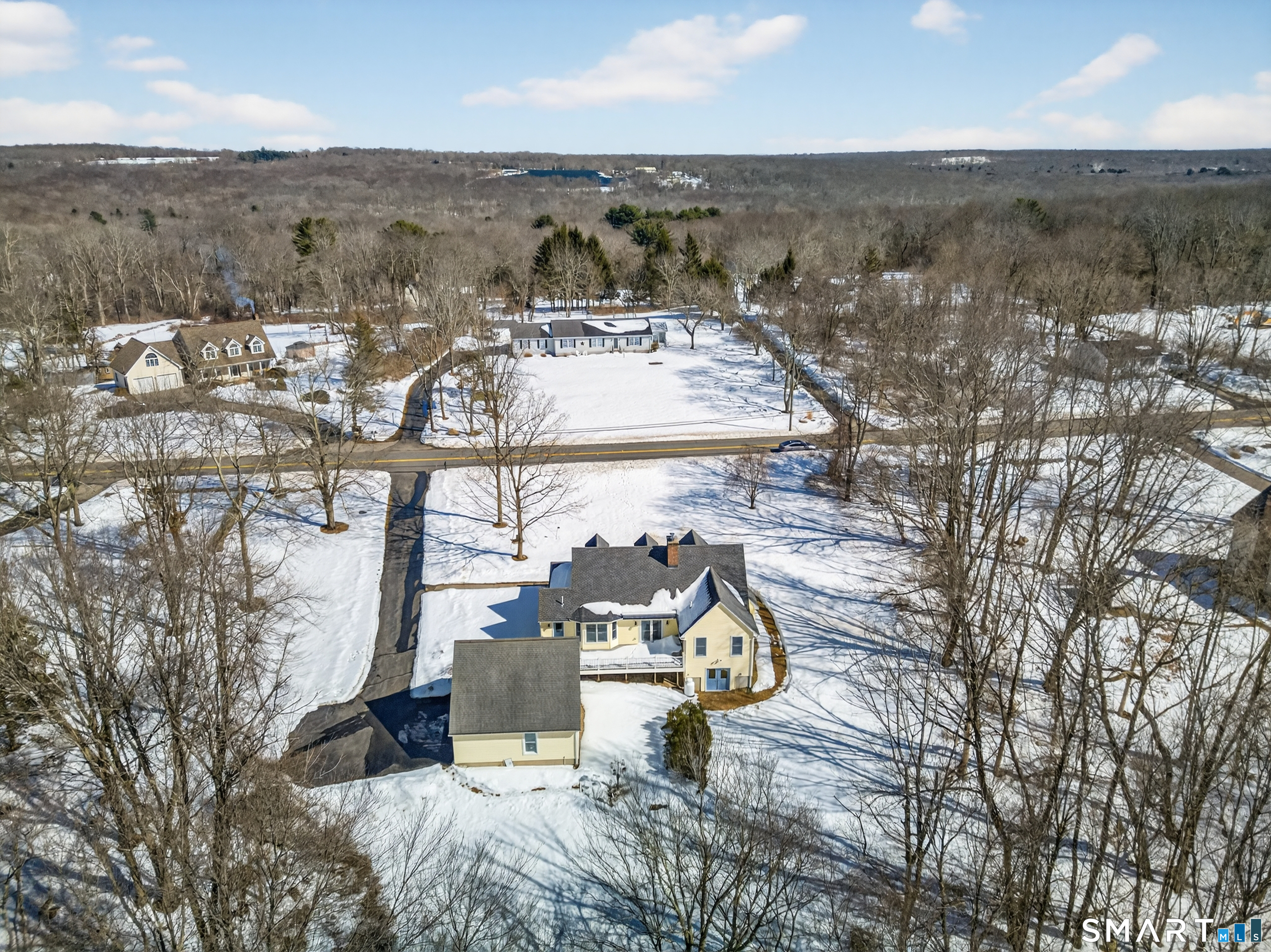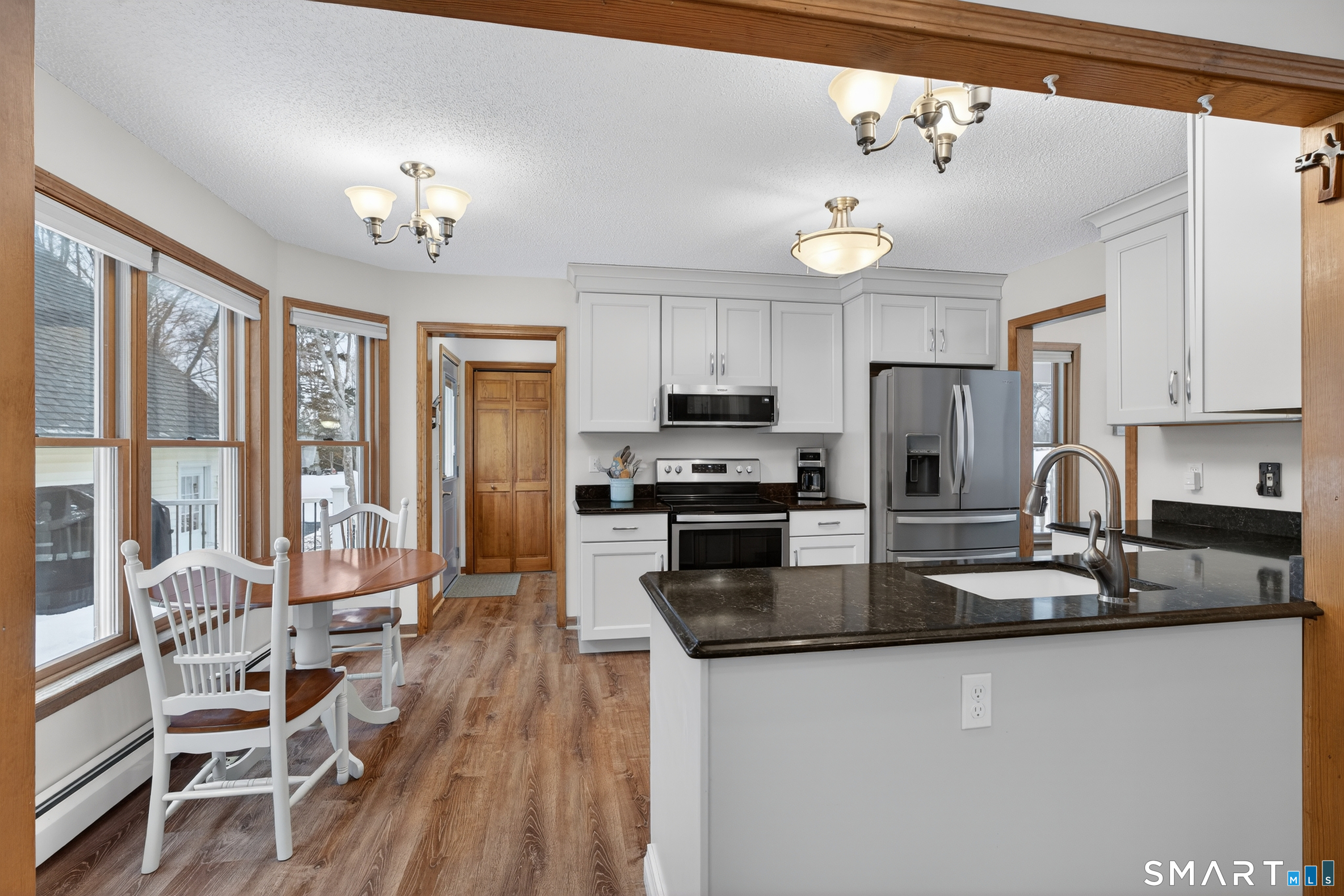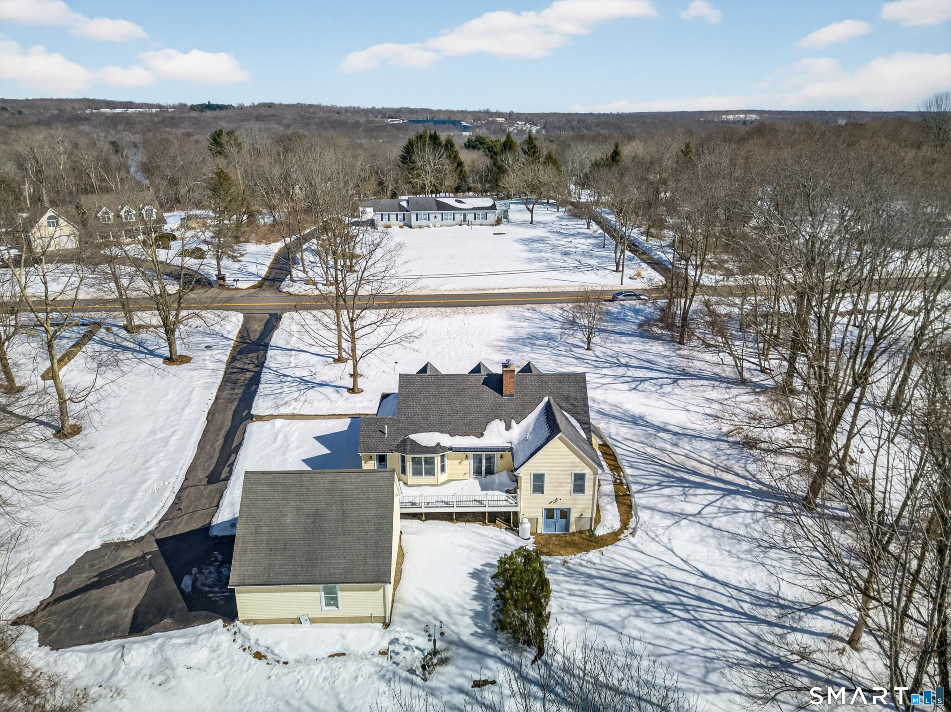 Charming storybook ranch with Cape-style curb appeal, complete with wrap-around front porch and classic dormers, set on a spacious yard bordered by woods. This thoughtfully designed home offers the ease of one-level living with dramatic architectural features and modern energy-efficient systems. The remodeled kitchen (approx. 4 years old) opens to a formal dining room, perfect for entertaining. A convenient mudroom leads to the laundry and pantry area for everyday functionality. The stunning two-story family room features a floor-to-ceiling fireplace and an open loft above, creating a bright, airy focal point. The private owner's suite includes deck access-ideal for a future hot tub-along with a custom walk-in closet system and a spa-like bath with double sinks, glass shower, and a large whirlpool tub. Two additional bedrooms and a full bath complete the main level. The finished walkout lower level provides flexible living space for a recreation room, home office, or gym. Energy efficiency is a major highlight with a nearly new heat pump for heating and cooling, plus newer bb heat for colder temperatures, delivering impressive utility savings. Located beside the desirable Woodbine neighborhood, this home offers a peaceful setting with great walking areas while still being convenient to town amenities